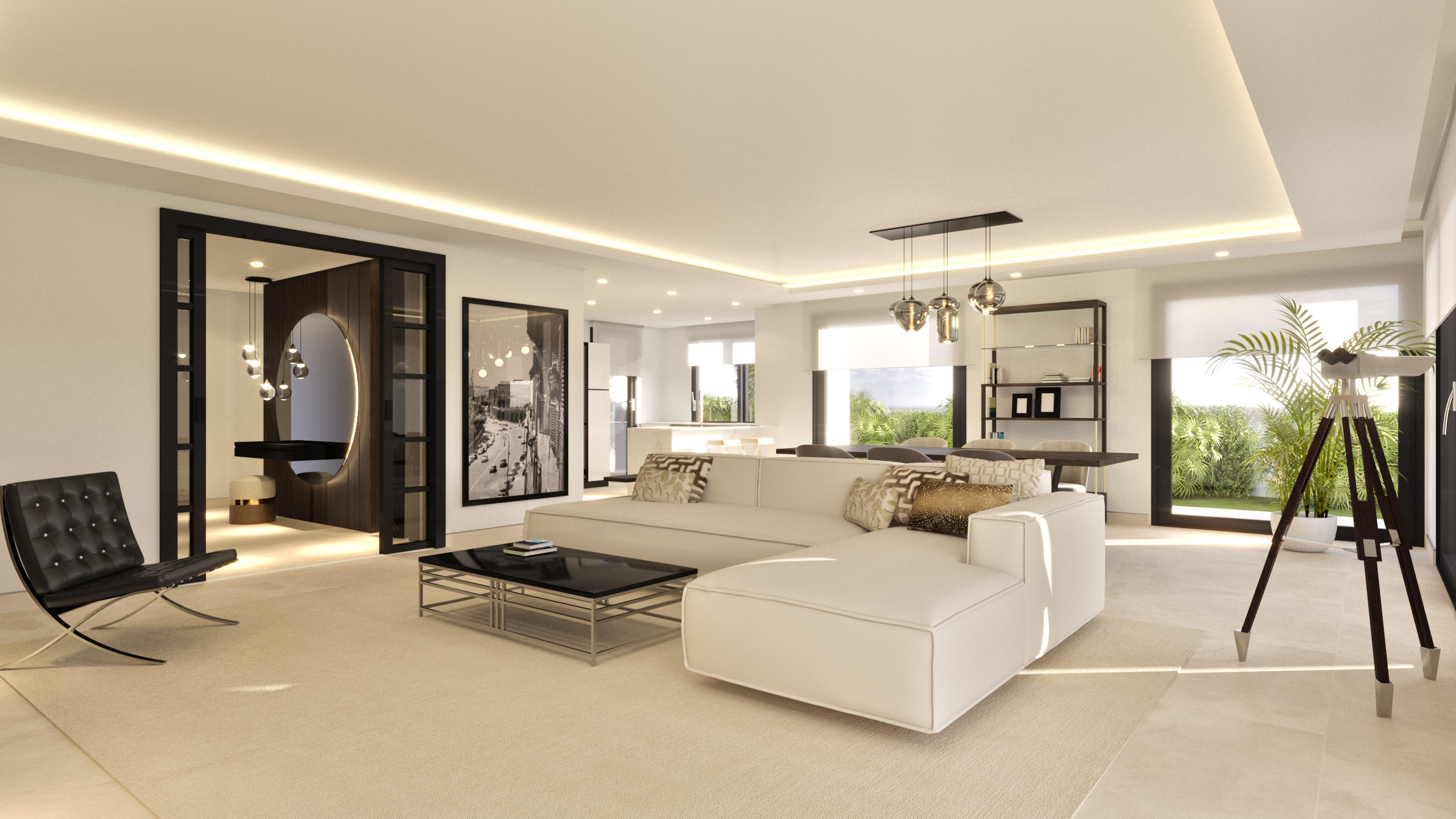 Mediante las infografías interiores 3D conseguimos un control extremo del acabado de nuestro diseño interior. Las infografías interiores son además una potente herramienta para la transmisión del resultado a su cliente. Gracias a los renders e infografías 3D hemos mostrado el resultado final de grandes villas o urbanizaciones en Marbella y Málaga mucho antes de su construcción o reforma definitiva.